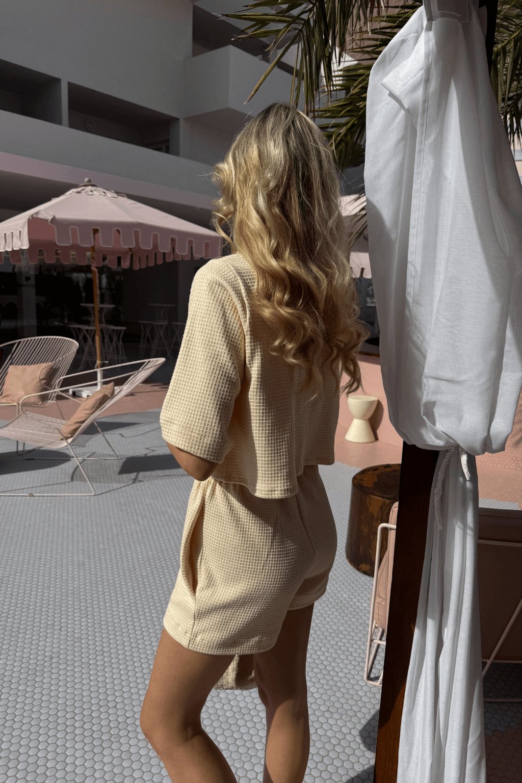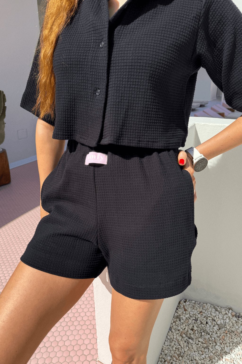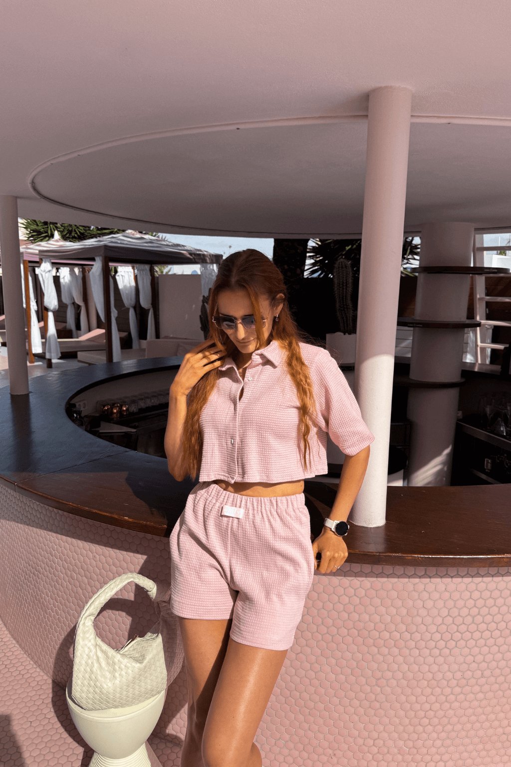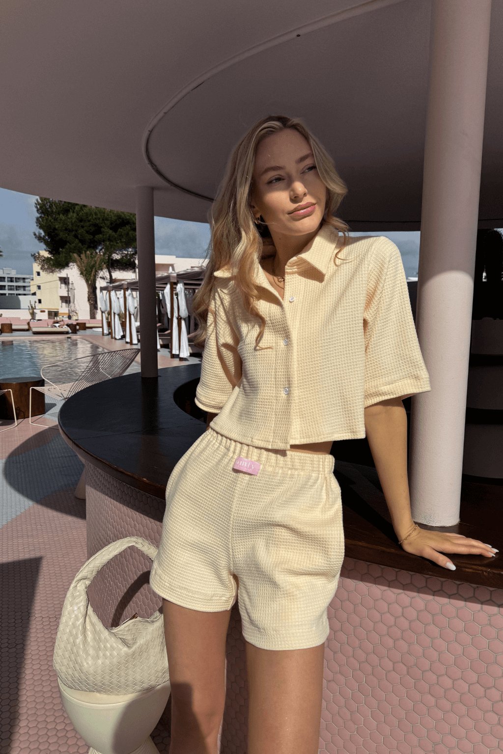 Košile má oversized střih, krátký rukáv po loket a díky vyšší gramáži krásně drží tvar. Aby se košile hodila k vaflovým šortkách s vysokým pasem, zvolily jsme pro ni crop délku. Zapínání jsme vyřešily na 3 knoflíky.